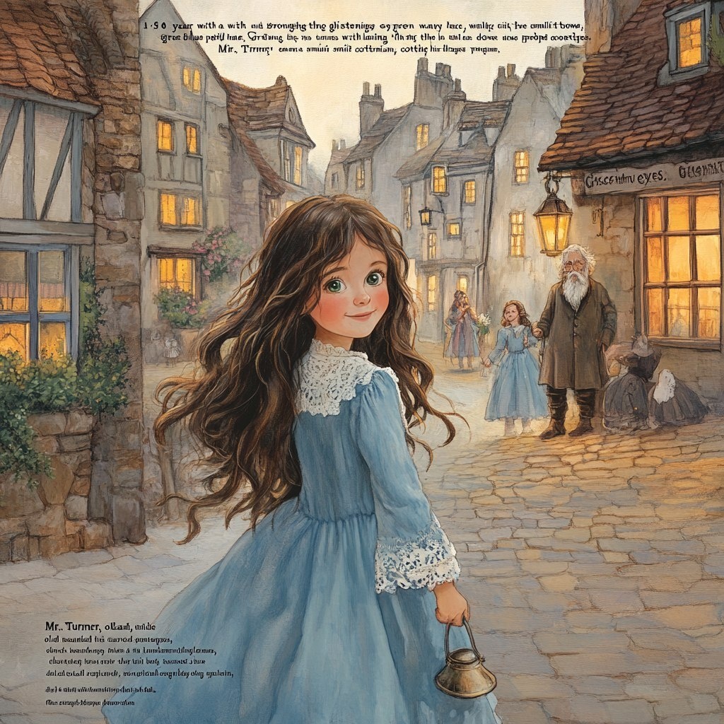 Создано на основе запроса: "9 year old , with long brown wavy hair, green glistenings eyes, Grace walking through the sunlit town in a light blue dress with lace collar, smiling as people wave from their doorsteps. Mr. Turner, old bearded gentleman, stands outside his cottage, holding his own lantern as a reminder of kindness. Soft morning light creates a warm glow over the streets. The art style should be storybook-like, whimsical, painterly, with gentle warm tones." --- Автоперевод: "9-летний, с длинными коричневыми волнистыми волосами, зелеными блестящими глазами, грацией, прогуливаясь по солнечному городу в голубого платье с кружевным воротником, улыбаясь, когда люди машут своим порогом. Мистер Тернер, старый бородатый джентльмен, стоит возле его коттеджа, удерживая его собственную ловушку в качестве напоминания о доброте. Отлично получилось? 🤔 https://dzen.ru/id/65c0c65c86e4f837c27b24d7 #ИИ #AI #нейросеть #midjourney #art