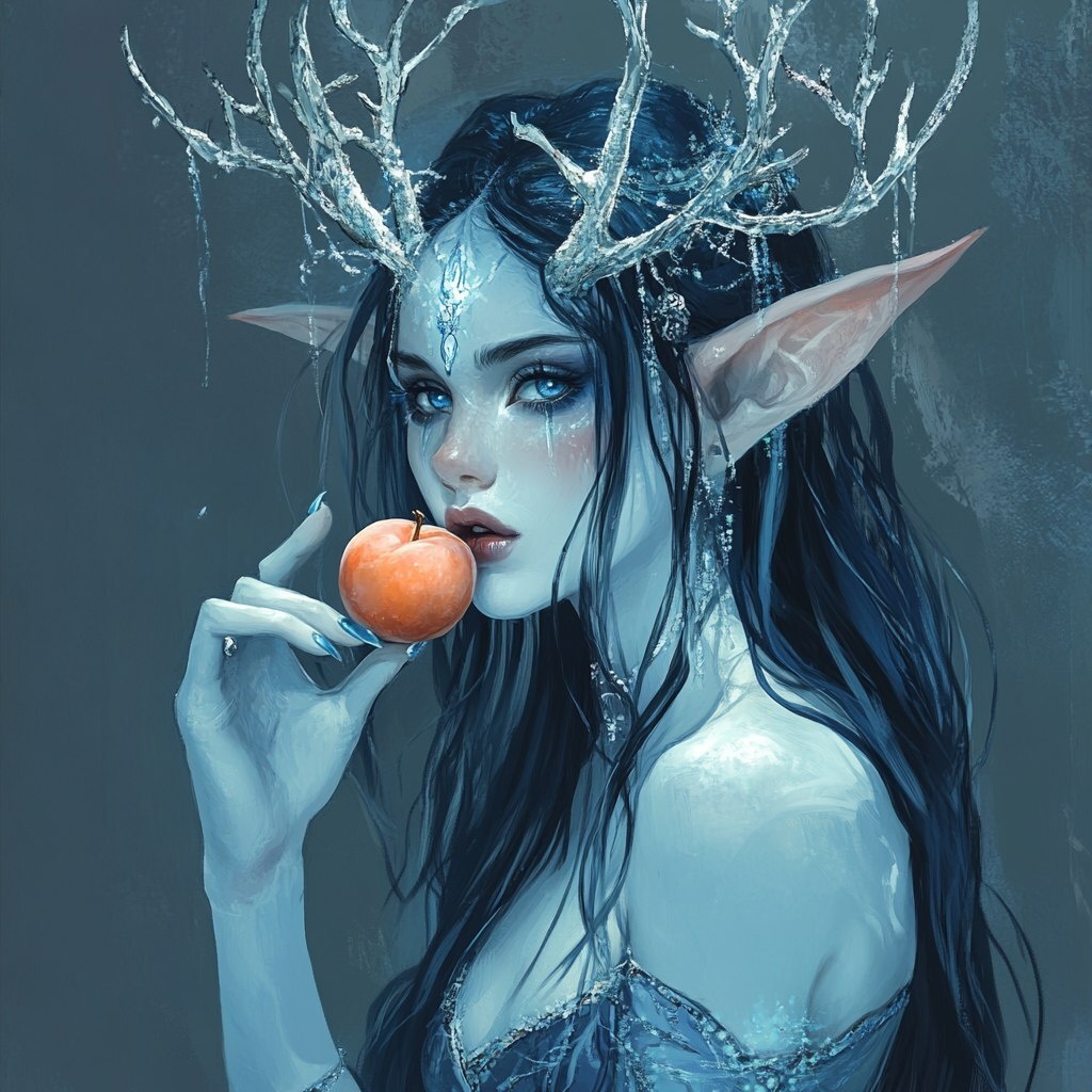 Создано на основе запроса: a young, beautiful dnd witch. She is elven, with blue skin, black eyes with blue irises, very long and pointed ears, and with long, pooling dark hair. She also has fey antlers made of ice growing from her head. She is holding a peach that she has taken a bite from, and is licking her lips.