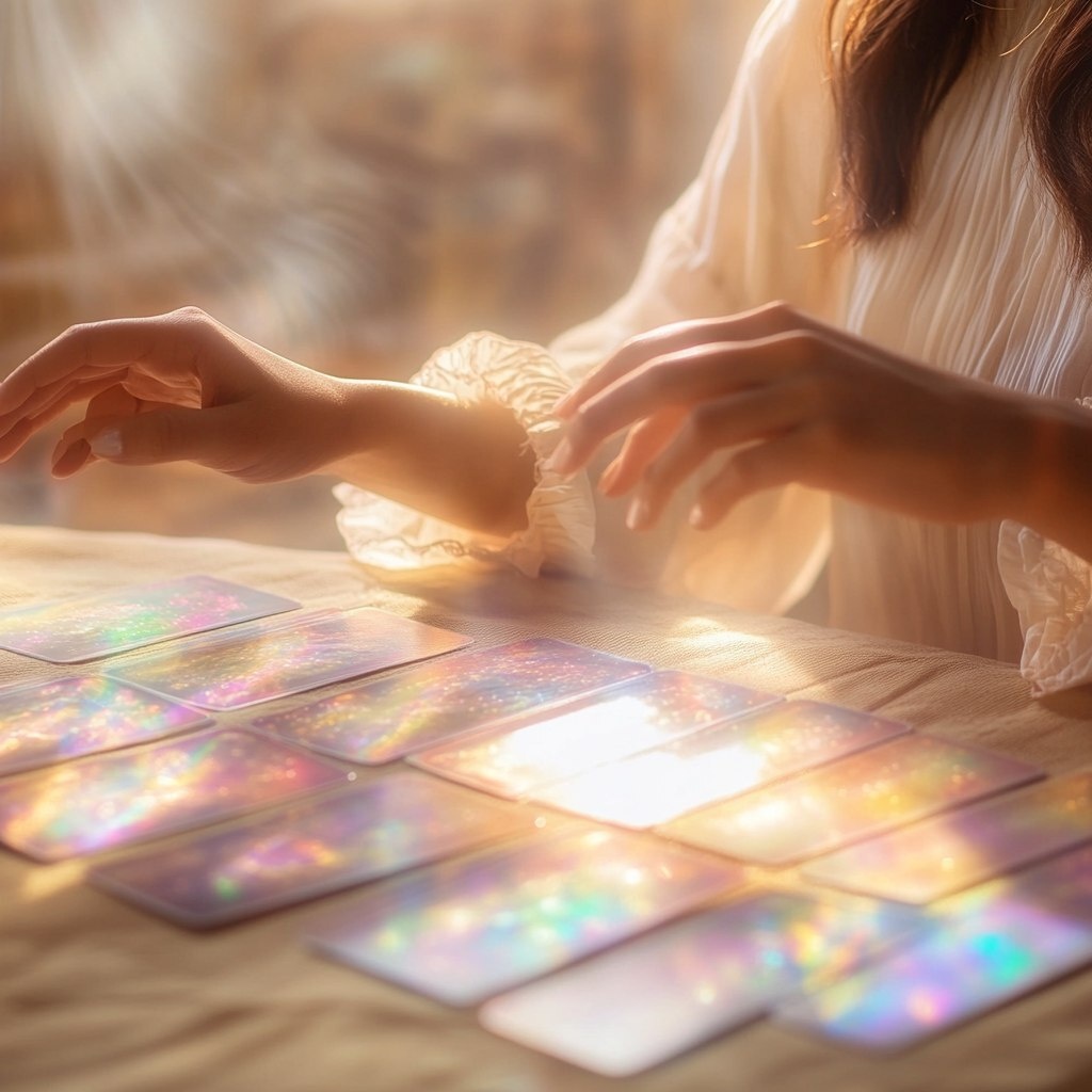 Создано на основе запроса: A table with intuitive cards and hands reaching out to touch them. A woman smiles softly as if receiving an insight. The lighting is soft, magical, with pastel tones and gentle reflections.