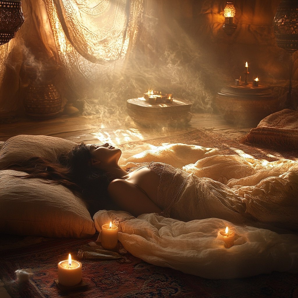 Создано на основе запроса: A warm, serene interior bathed in soft, golden light. A cozy setup with textured blankets, layered pillows, flickering candles, and delicate swirls of incense in the air. In the center the relaxed outline of a woman lying peacefully, eyes closed, as if held by the space. Everything whispers calm, softness, and inner trust. --- Автоперевод: Теплый, безмятежный интерьер, купанный мягким, золотым светом. Неплохо получилось? 🤔 https://dzen.ru/id/65c0c65c86e4f837c27b24d7 #ИИ #AI #нейросеть #midjourney #art