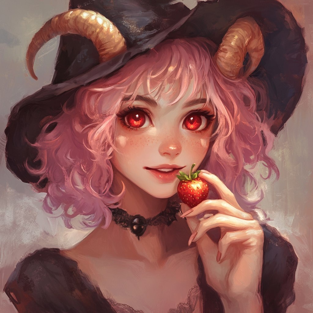 Создано на основе запроса: a cute, young, female, tiefling witch. She has curly but very soft, downy pink hair, brilliant red eyes, a cute youthful face, and a cutesy witches hat. She has two curling goat horns and two holes in her hat to allow them. She has paper white, pale skin, and looks to be a young adult. She is marvelling with glee at a small, half eaten strawberry between her fingers. --- Автоперевод: Милая, молодая, женщина, ведьма. Классно получилось? 🤔 https://dzen.ru/id/65c0c65c86e4f837c27b24d7 #ИИ #AI #нейросеть #midjourney #art