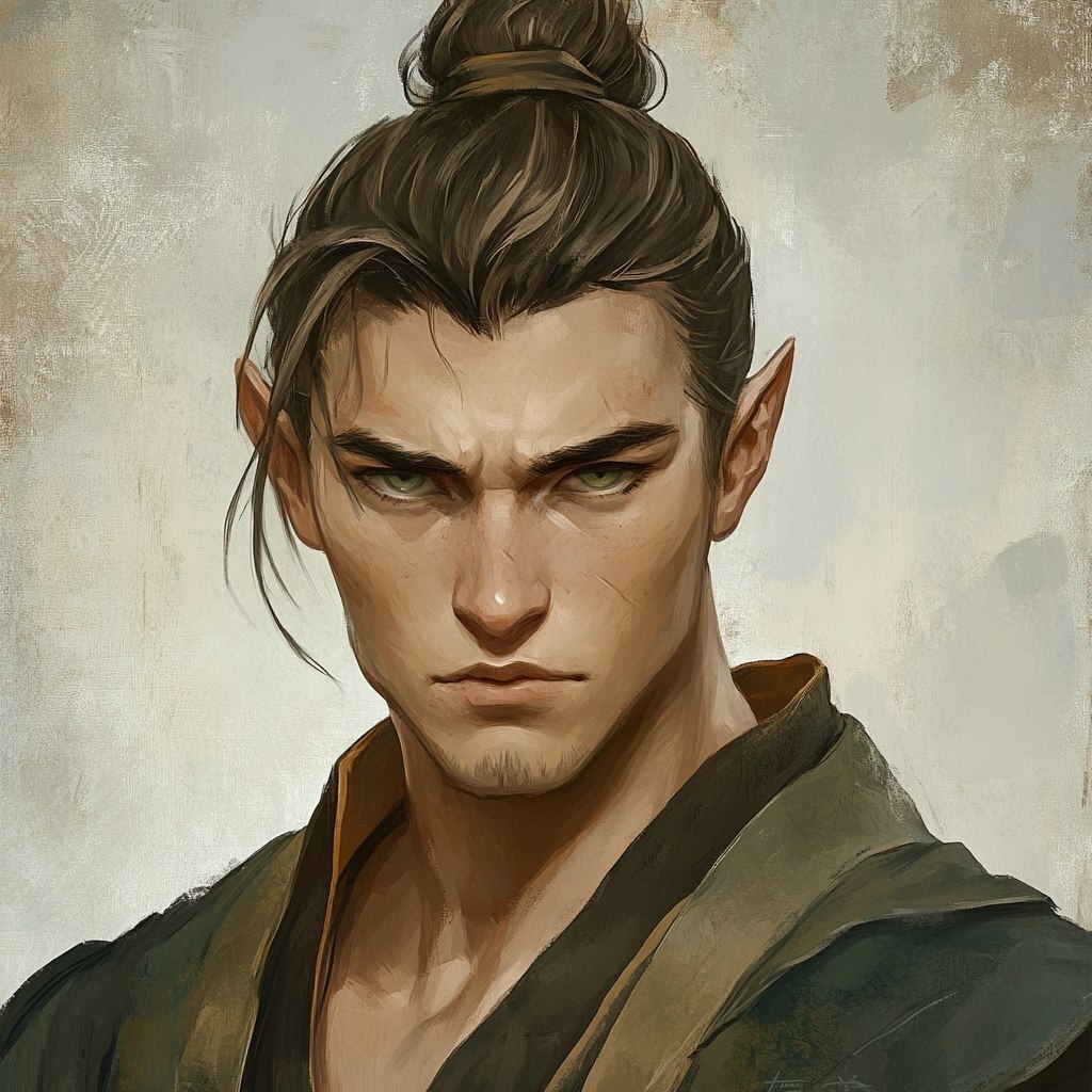 Создано на основе запроса: half-elf, young, male, monk, martial artist, short ash brown hair down to shoulders with top knot, bright green
