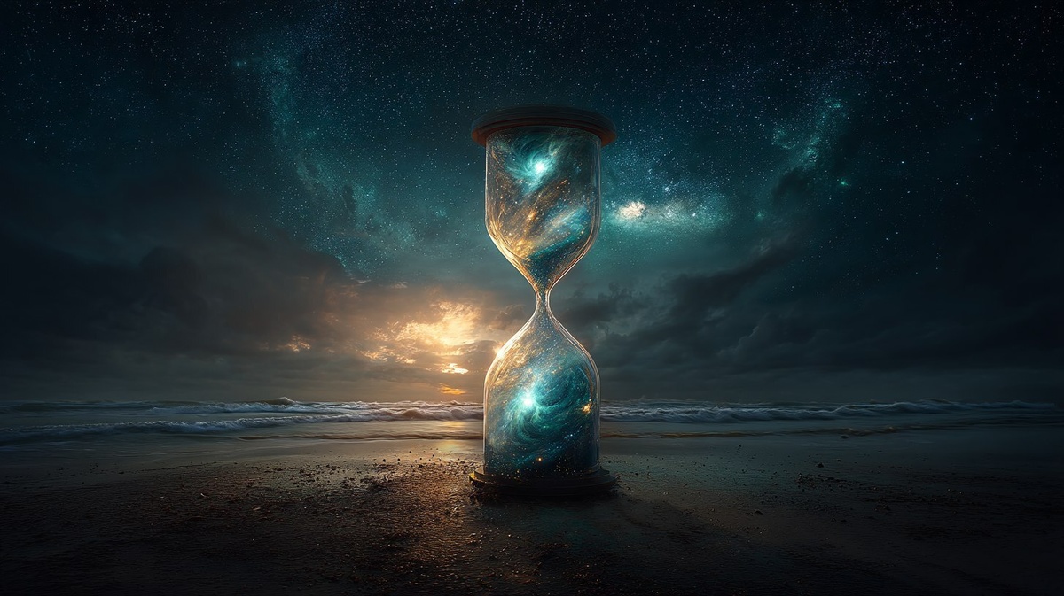 Создано на основе запроса: surreal and symbolic depiction of a cosmic nebulae summarized inside an empty Hourglass standing on a beach