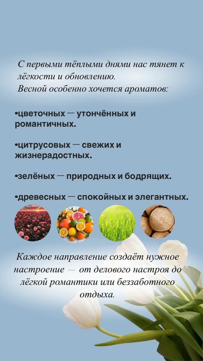 Хочется лёгкости, свежего воздуха, движения, цветов и солнца. Всё это мы ощущаем через запахи.