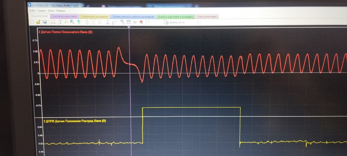 Ошибка P0342 Hyundai Accent Tagaz. P0342 - низкий уровень сигнала Датчика положения распредвала, датчик новый подкидывали, проводка проверена, ГРМ и цепь стоят по меткам. Осциллограмма показала, что есть рассинхронизация ДПКВ с ДПРВ, фронт сигнала датчика распредвала должен стоять там где проходит фиолетовая направляющая, ровно по центру пропуска задающего диска ДПКВ. При более детальном осмотре было замечено что провернуло шпонку коленвала.