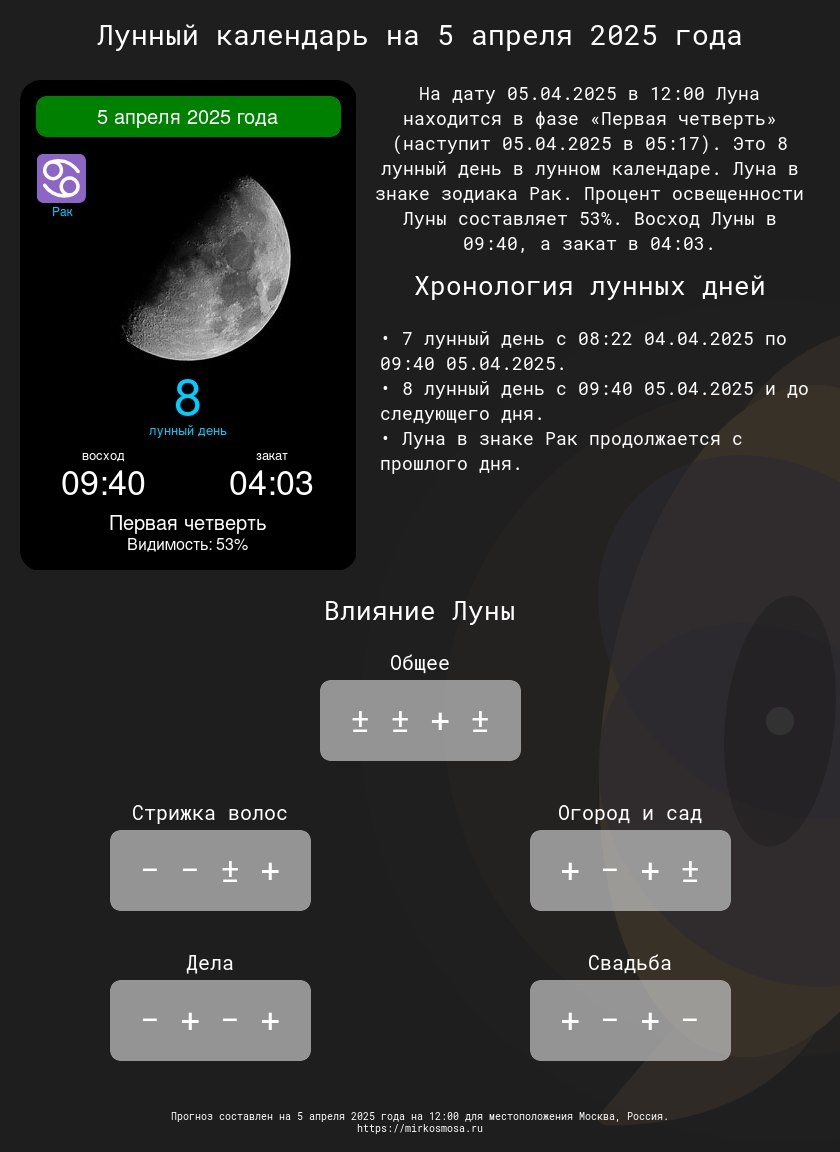 Лунные календари на 5 апреля 2025 года: Подготовьтесь к этому дню с учетом влияния Луны
