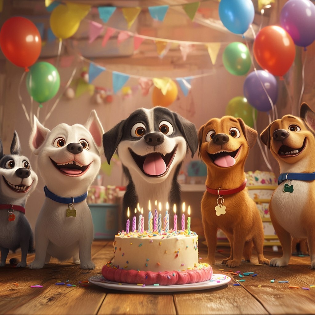 Создано на основе запроса: happy birthday dogs with cake, balloons in background, Warner Bros style