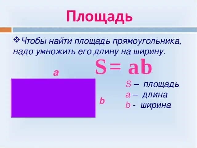 Площадь в математике — это величина, которая показывает, сколько места занимает фигура на плоскости. Площадь измеряется в квадратных единицах. Основные единицы измерения площади — квадратные сантиметры (см²), квадратные метры (м²), квадратные миллиметры (мм²) и квадратные километры (км²). В математике площадь обозначается буквой S.