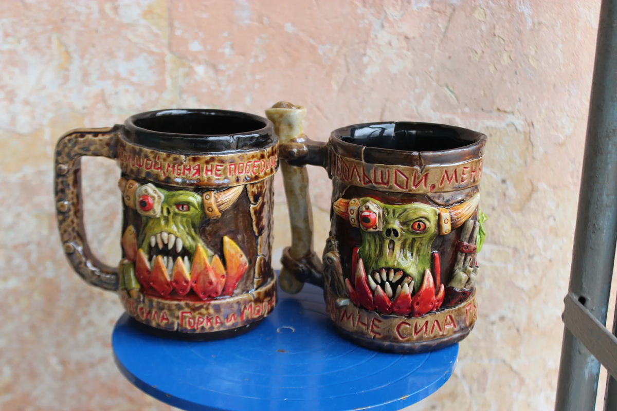 Пост Капибарина Chatlanin Кружки делались на заказ. Собирались из пласта керамической массы. Вся орочья братия лепилась и раскрашивалась вручную. Обжиги 1060/1200 градусов. Объём около литра. Обсудить: https://kapi.bar/post/dvoinoi-vaaagh