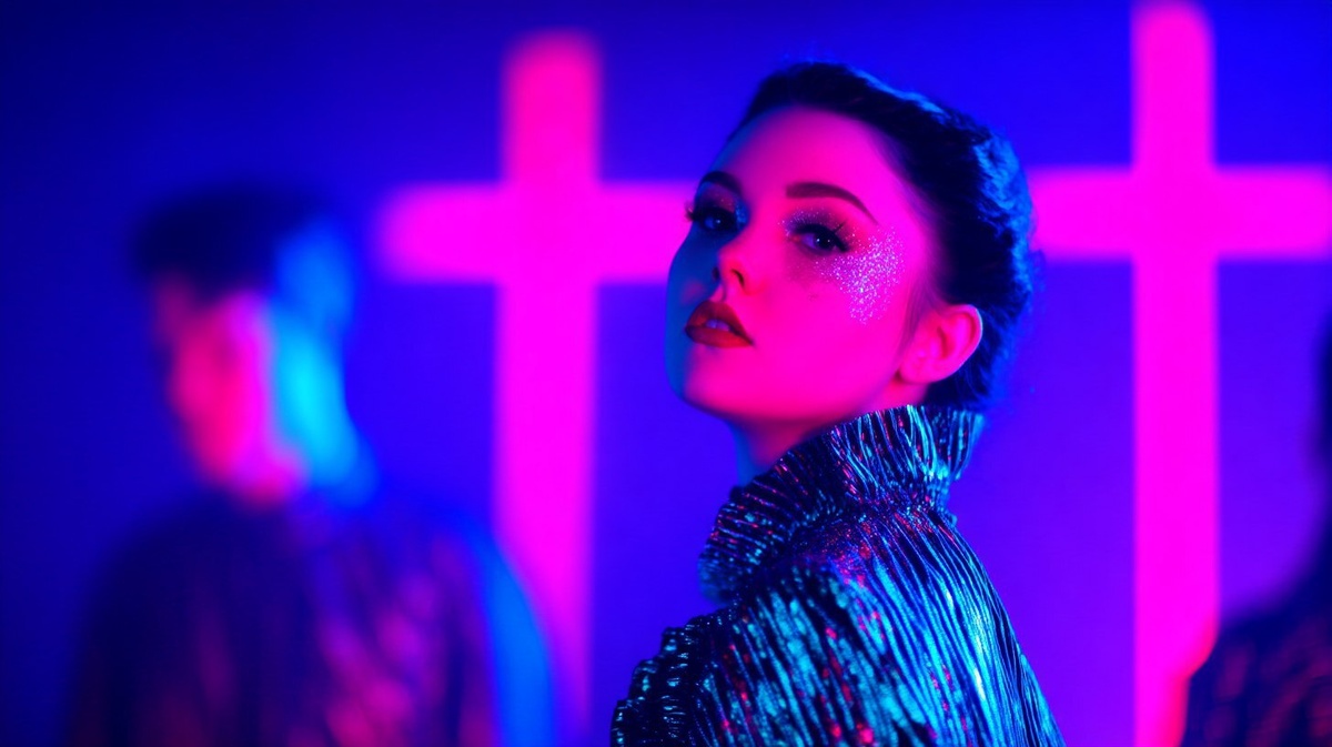 Создано на основе запроса: A model in a metallic ruffled cape stands in the nave of an abandoned church filled with fog and laser beams. Neon crosses glow faintly behind shattered stained glass. Mascara tears glitter on their cheeks as they hold a synth keyboard like an offering. Technique: Ambient fog, low-angle strobe lighting, color gels, and composited stained-glass reflections. Mood: Sacred melodrama. Like if Depeche Mode shot a video in Heaven by Marc Jacobs. --- Автоперевод: Модель в металлическом плащном плащке стоит в невом заброшенной церкви, наполненной туманом и лазерными лучами. Круто получилось? 🤔 https://dzen.ru/id/65c0c65c86e4f837c27b24d7 #ИИ #AI #нейросеть #midjourney #art