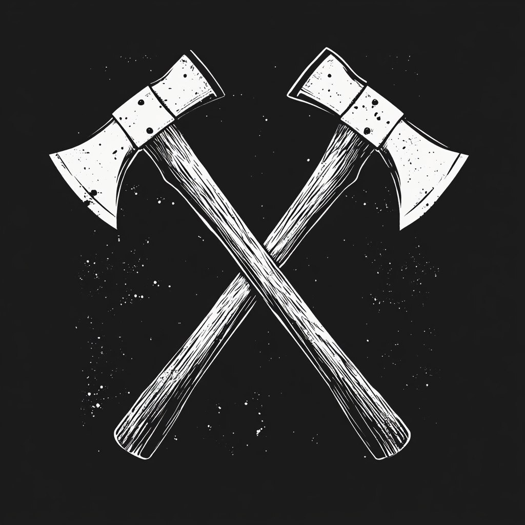 Создано на основе запроса: Minimalist, graphic design of two crossed lumberjack axes with double-edged blades, white on a black background