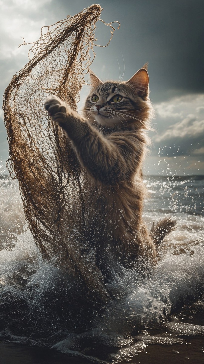 Создано на основе запроса: realistic bipedal cat in action throwing a large fishing net into the sea, strong pose, water splashing, cloudy sky, cinematic dynamic movement