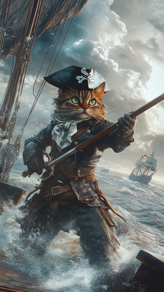 Автоперевод: гиперреалистичный, ультрауделенный, 8K, кинематографическое освещение, двуногие пиратские кошки, сжимающие нисъемку, вражеский корабль приближается на расстоянии, штормовые облака, драматическое напряжение
