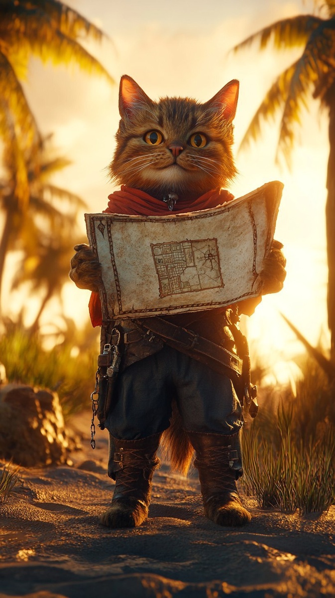 Создано на основе запроса: hyper-realistic, ultra-detailed, 8K, cinematic lighting, bipedal pirate cat holding an ancient treasure map, standing on a tropical island shore, palm trees, golden sunset, mysterious atmosphere --- Автоперевод: Гипер-реалистичный, ультрауделенный, 8K, кинематографическое освещение, двуногие пиратские кошки с древней картой сокровищ, стоящая на берегу тропического острова, пальмы, золотой закат, таинственная атмосфера Как тебе такое изображение? 🤔 https://dzen.ru/id/65c0c65c86e4f837c27b24d7 #ИИ #AI #нейросеть #midjourney #art