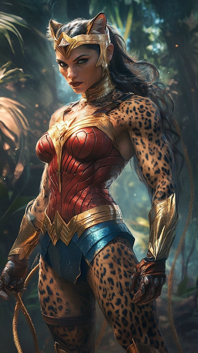 Создано на основе запроса: a hyper realistic powerful hybrid creature, fusion of a fierce leopard and Wonder Woman, wearing a golden tiara and red-blue armor, muscular build, feline features with human form, intense gaze, standing in a dynamic superhero pose, detailed fur texture, golden lasso at waist, jungle background with mythic glow --- Автоперевод: Гипер реалистичное мощное гибридное существо, слияние ожесточенного леопарда и чудо-женщины, одетый в золотую тиару и красную голубую броню, мышечную сборку, кошачьи особенности с человеческой формой, интенсивный взгляд, стоящий в динамичной позе супергероя, подробная текстура меха, золотой лассо на талии, фон джунглей с миафическим сиянием. Круто получилось? 🤔 https://dzen.ru/id/65c0c65c86e4f837c27b24d7 #ИИ #AI #нейросеть #midjourney #art