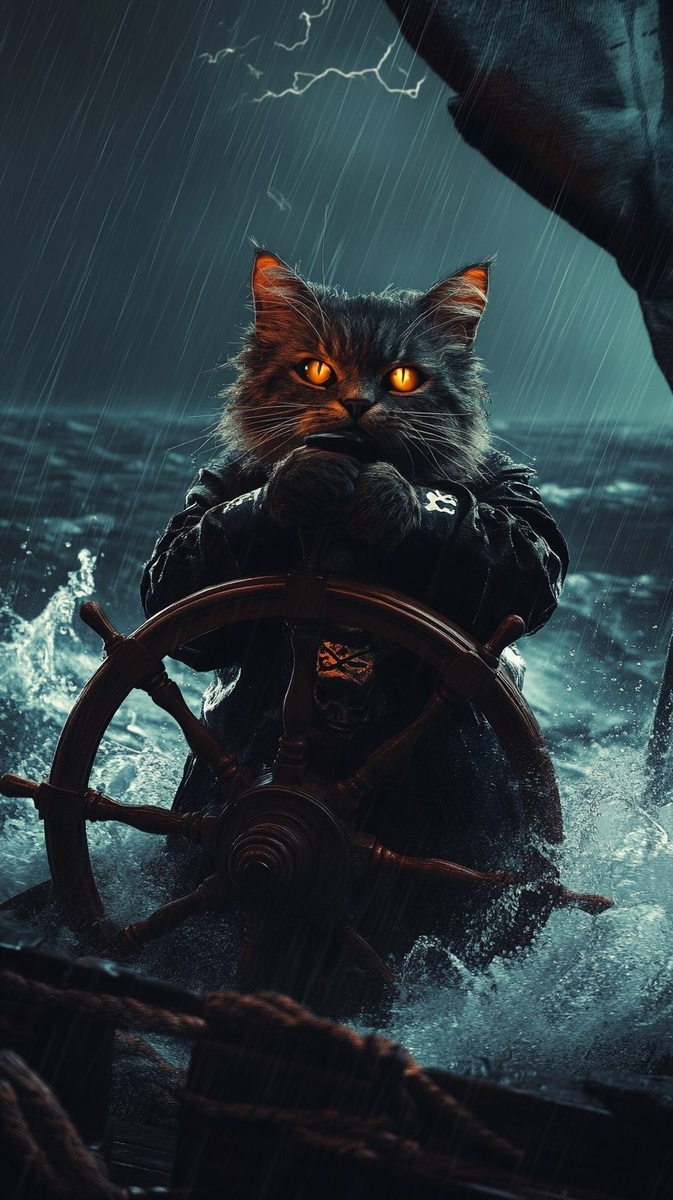 Создано на основе запроса: hyper-realistic, ultra-detailed, 8K, cinematic lighting, bipedal pirate cat gripping the ship’s wheel, massive