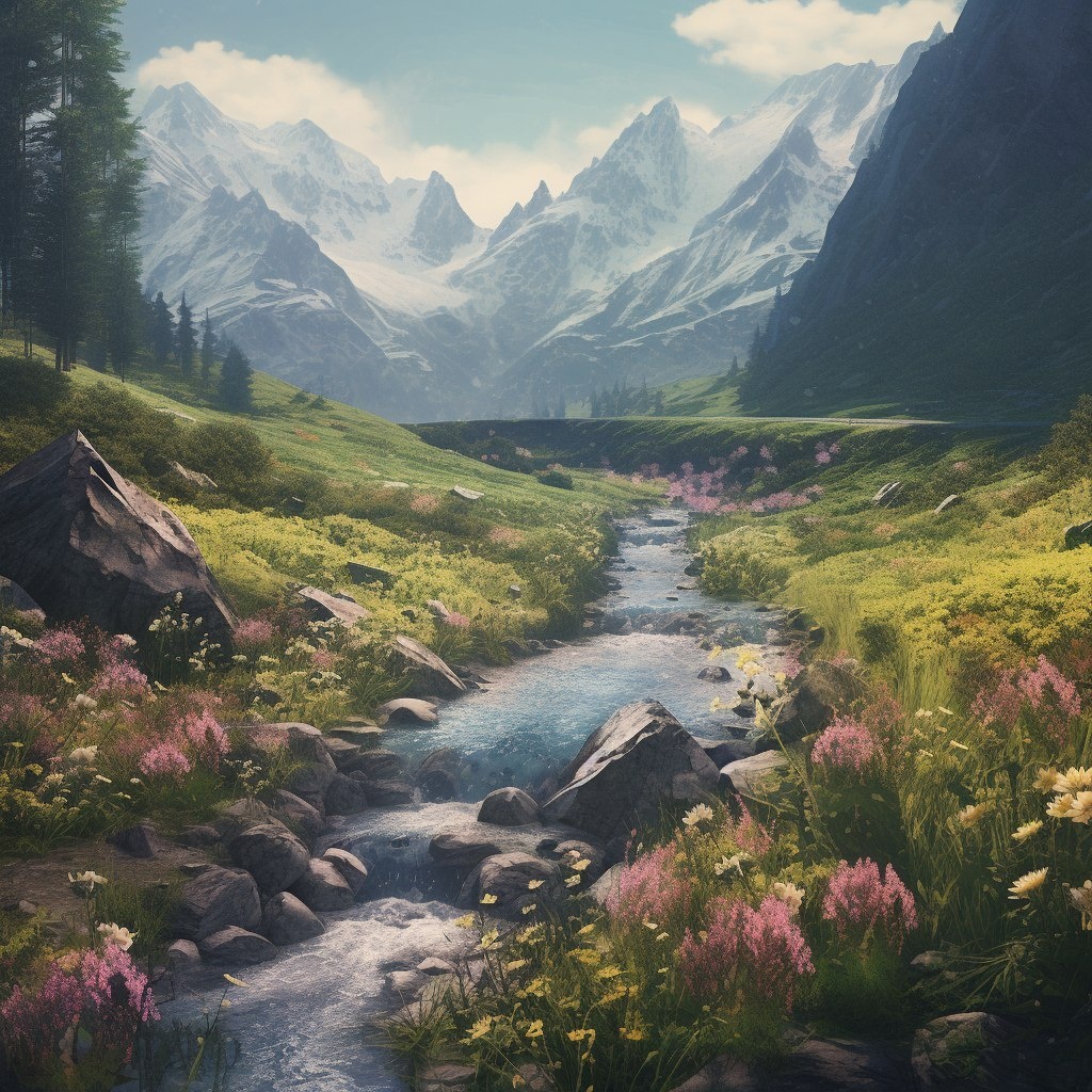 Создано на основе запроса: a mountain scene with wild flowers and a stream v 7