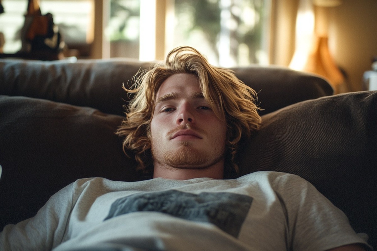 Создано на основе запроса: young man with shoulder length blonde hair sitting on a couch in carmel, ca lazily changing the channel