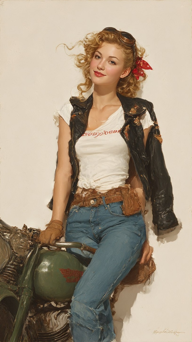 Создано на основе запроса: Golden age illustration reminiscent of Leyendecker, Rockwell and Elvgren. A beautiful pin up. Jeans. White t-shirt. Leather motorcycle jacket. Wild hair. --- Автоперевод: Золотой век иллюстрация напоминает Лейендекер, Роквелл и Элвгрен. Как тебе генерация? 🤔 https://dzen.ru/id/65c0c65c86e4f837c27b24d7 #ИИ #AI #нейросеть #midjourney #art