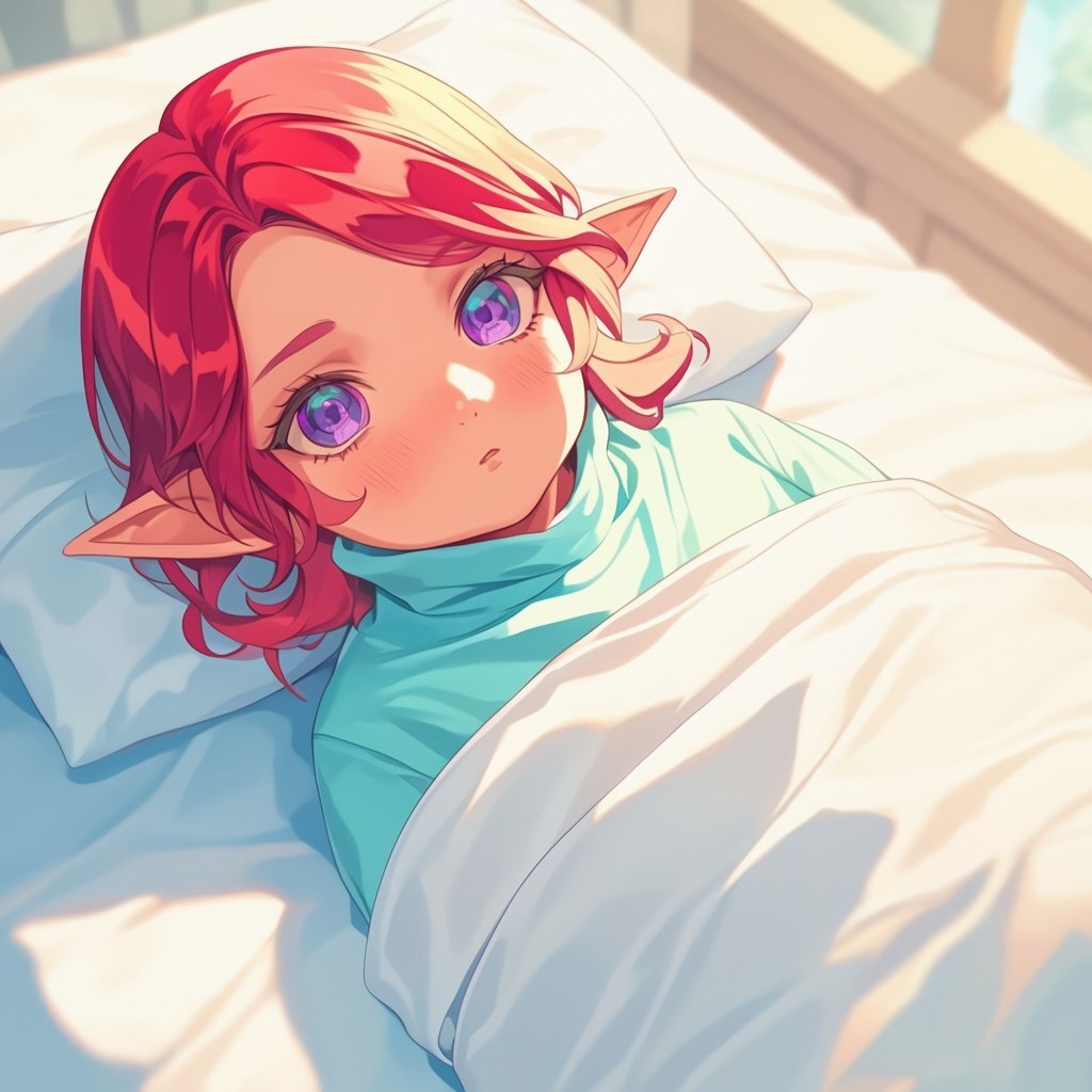 Создано на основе запроса: Infant female elf with aqua colored skin and bright red hair and purple eyes, in swaddling, drawn