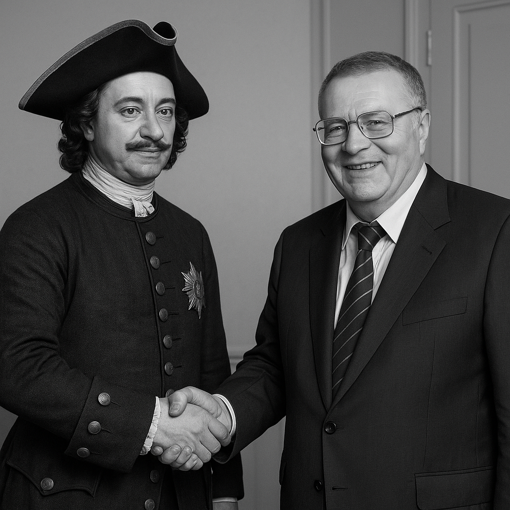 Всем привет! Поигрался с нейросетью и вот что из этого вышло😹 Сенсация! Пётр Первый и Владимир Жириновский: Тайная встреча, которую скрывали веками Автор: Очевидец абсурда В истории России полно тайн. Но одна из них шокирует даже бывалых конспирологов: Пётр I и Владимир Жириновский были знакомы. И нет, это не ошибка, не розыгрыш и не фантастика — это жёсткая правда, которую от нас скрывали веками! Хронологический парадокс? Только не для посвящённых! Как известно, Пётр I правил в XVIII веке, а Владимир Вольфович Жириновский родился в XX веке. На первый взгляд, встреча невозможна. Но только для тех, кто не знает о секретных проектах царской России и экспериментах с временными порталами, проведёнными ещё в начале XVIII века. Источники из архивов Российской Академии Наук, хранящиеся под грифом “Совершенно Секретно”, подтверждают: в 1717 году во время Великого посольства Пётр I на 4 дня исчез в районе Амстердама. Официальная версия: “исследовал устройство верфей”. Но новые докуме