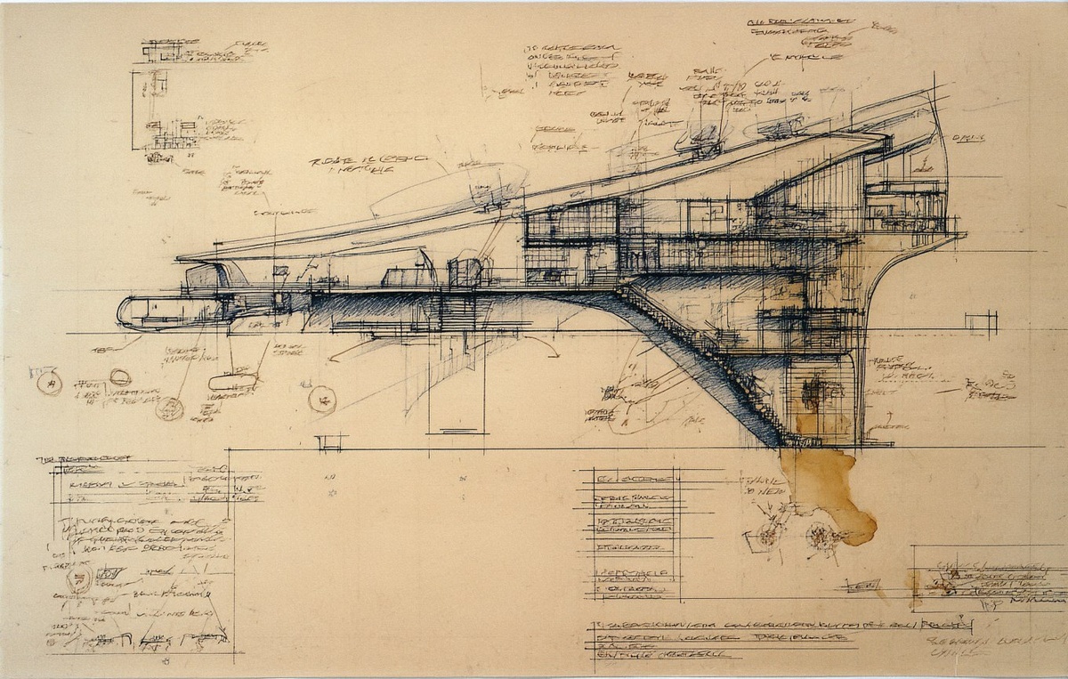 Создано на основе запроса: design drawing, brutalist aerodome, coffee-stained, technical with some schematics and annotation, architectural