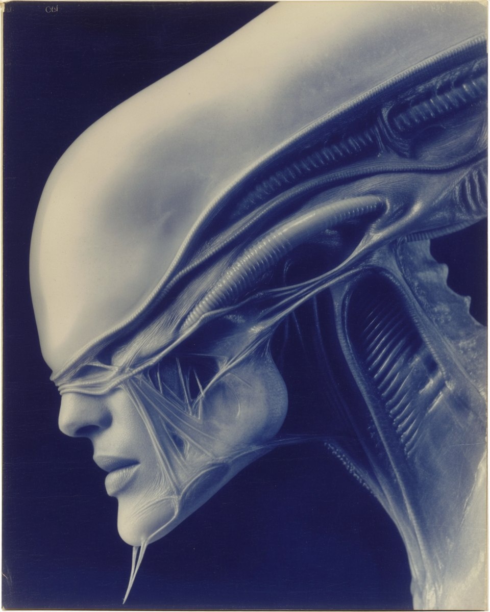Создано на основе запроса: vintage polaroid of hybrid ghost xenomorph piglet aliens, mono cyanotype, high detail, focus lens blur, sci-fi