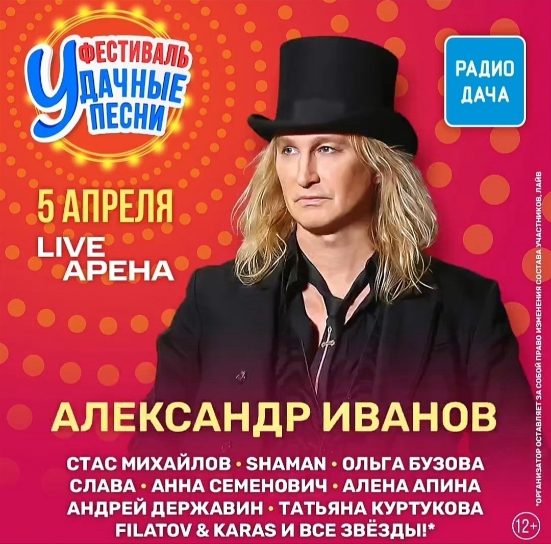 ⚡️Дорогие друзья! Уже сегодня вечером на сцене Live Арена состоится ежегодный музыкальный праздник – Большой фестиваль «Удачные песни». В Праздничном концерте примут участие Александр Иванов и группа «Рондо»! Приходите! 🔥 ✨️ Вас ждут стопроцентные хиты, зажигательные танцы и все звёзды на одной сцене, а также красочное шоу и атмосфера праздника в самых лучших традициях «Радио Дача»! 🌟 «Удачные песни» – фестиваль, который покоряет с первых нот! Фестиваль, с которого начнется ваша весна! Один из лучших подарков – это яркие эмоции. Подарите незабываемый праздник себе и своим близким. 🕖 Начало в 19:00 📌 🎫 Немного билетов по ссылке: https://xn--80aheap1acotn0c9b.xn--p1ai/ #АлександрИванов #Рондо #ГруппаРондо #Москва #LiveАрена #РадиоДача #Фестиваль #УдачныеПесни