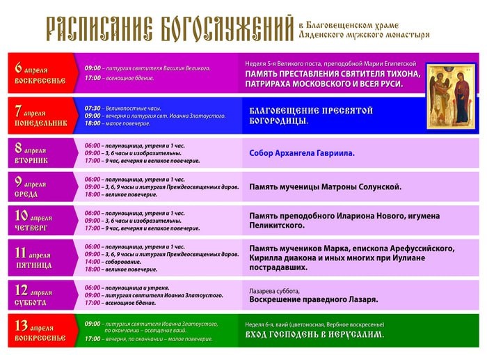 Расписание богослужений в Ляденском монастыре 6-12 апреля 2025 г