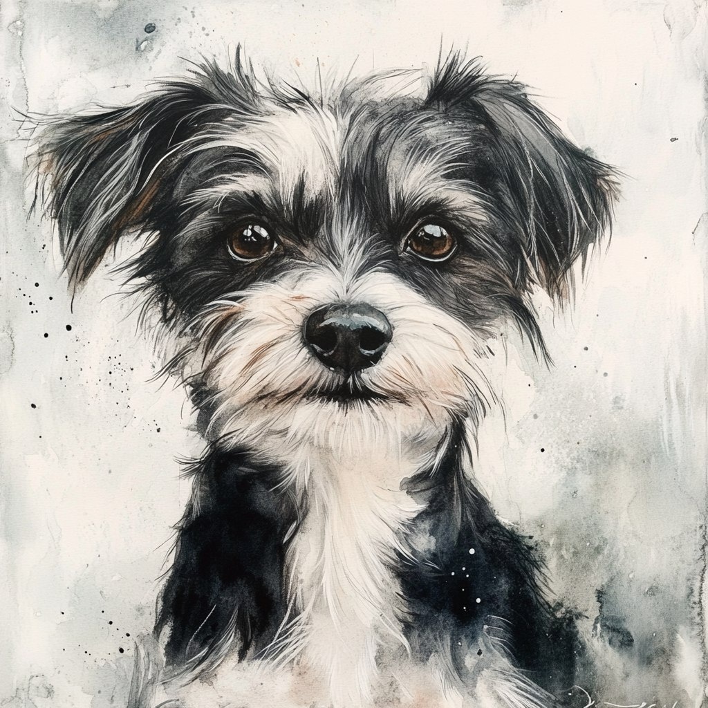 Создано на основе запроса: watercolor painting of a scruffy, wiry haired, black and white dog --- Автоперевод: акварельная картина грязного, проволочного, черно -белого собаки Красиво выглядит? 🤔 https://dzen.ru/id/65c0c65c86e4f837c27b24d7 #ИИ #AI #нейросеть #midjourney #art