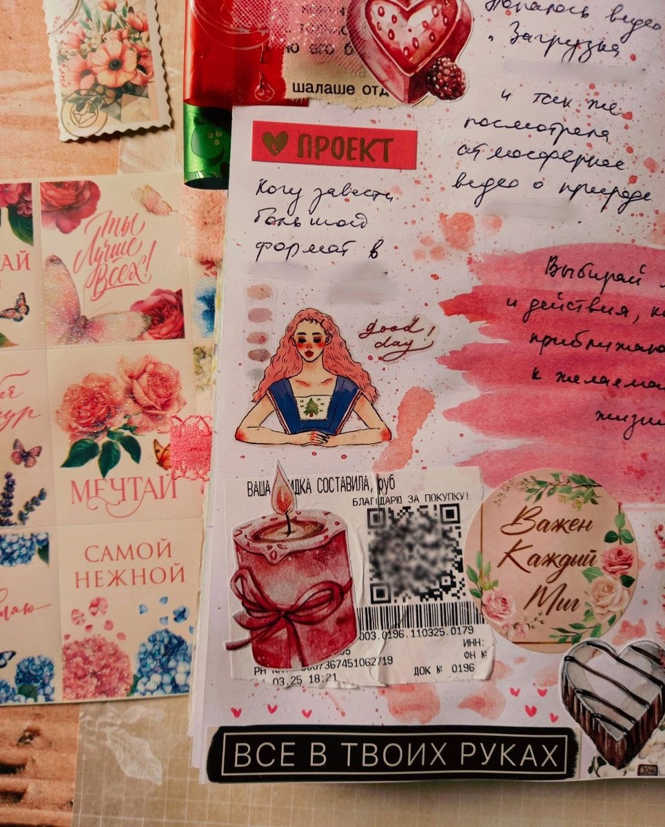 ❤️🔥 Разворот, сделанный на основе предоформления, которое можно увидеть в предыдущем видео. Как мне нравится эта методика! 🥰 - каждый раз в новом развороте тебя ждут какие-то готовые элементы, и на их основе (учитывая их) ты творишь и добавляешь сегодняшнее. Как будто это игра, и после каждого такого дооформленного разворота просыпается ещё больший творческий аппетит вдохновения! 💖