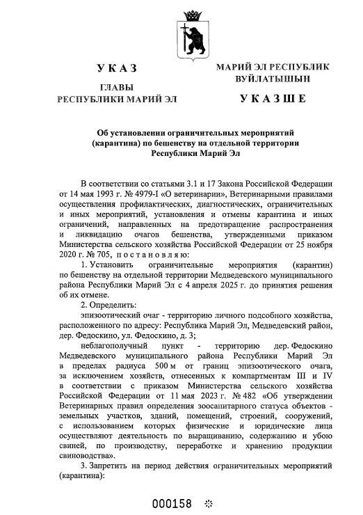 ❗️В деревне Федоскино в Медведевском районе объявили карантин по бешенству, следует из Указа главы Марий Эл.