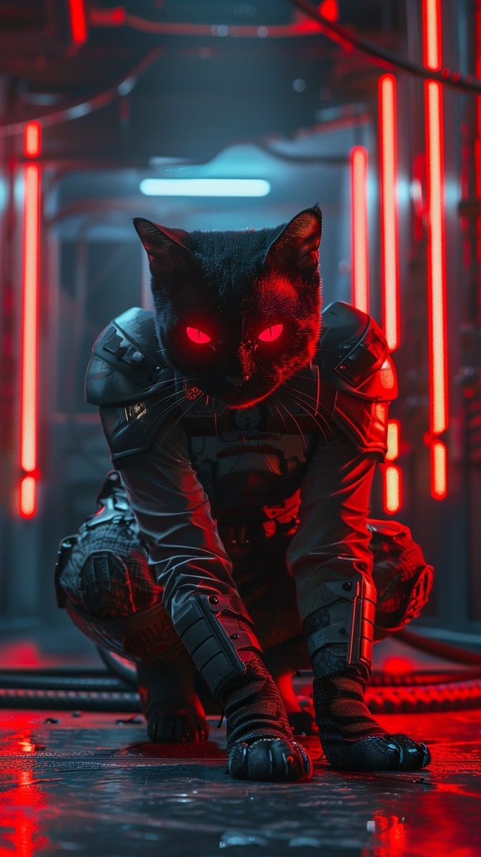 Создано на основе запроса: a stealthy black cat in a tight tactical suit, glowing red eyes, crouched in a spy pose, futuristic interior