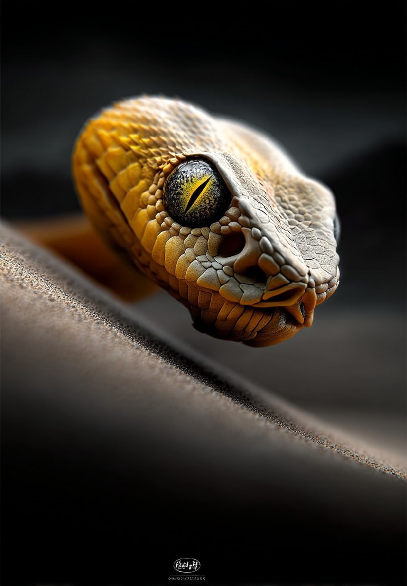 Создано на основе запроса: a poster of the desert viper, yellow sand. large dunes. sunrise. trompe l'oeil, 3D impression. high contrast, sharp focus, hyper-realism, high resolution, high detail. cinematic, Rembrandt lighting, chiaroscuro. Minimalist, blurry background --- Автоперевод: Плакат пустынной гадюки, желтый песок. Красиво вышло? 🤔 https://dzen.ru/id/65c0c65c86e4f837c27b24d7 #ИИ #AI #нейросеть #midjourney #art
