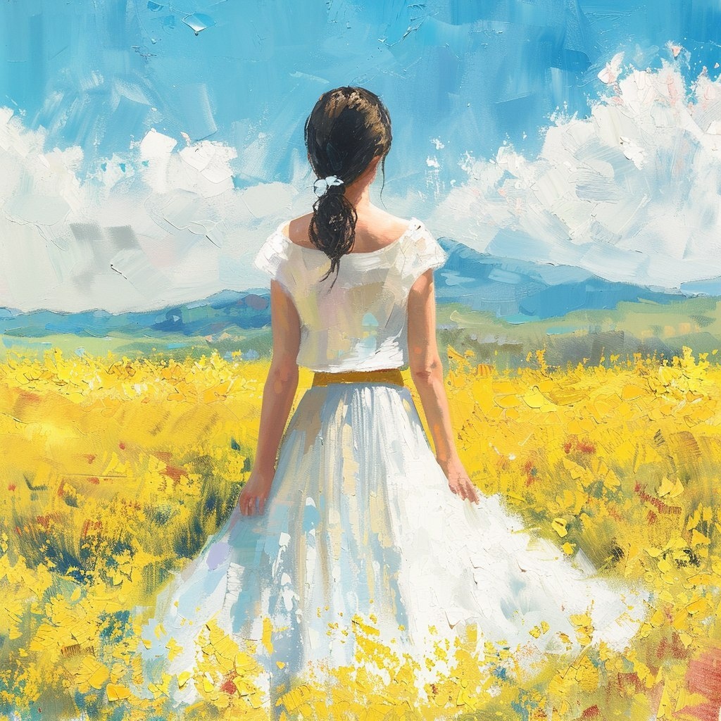 Создано на основе запроса: In the Chinese rapeseed flower field, a woman's elegant back, wearing a white skirt, high-definition, 8K