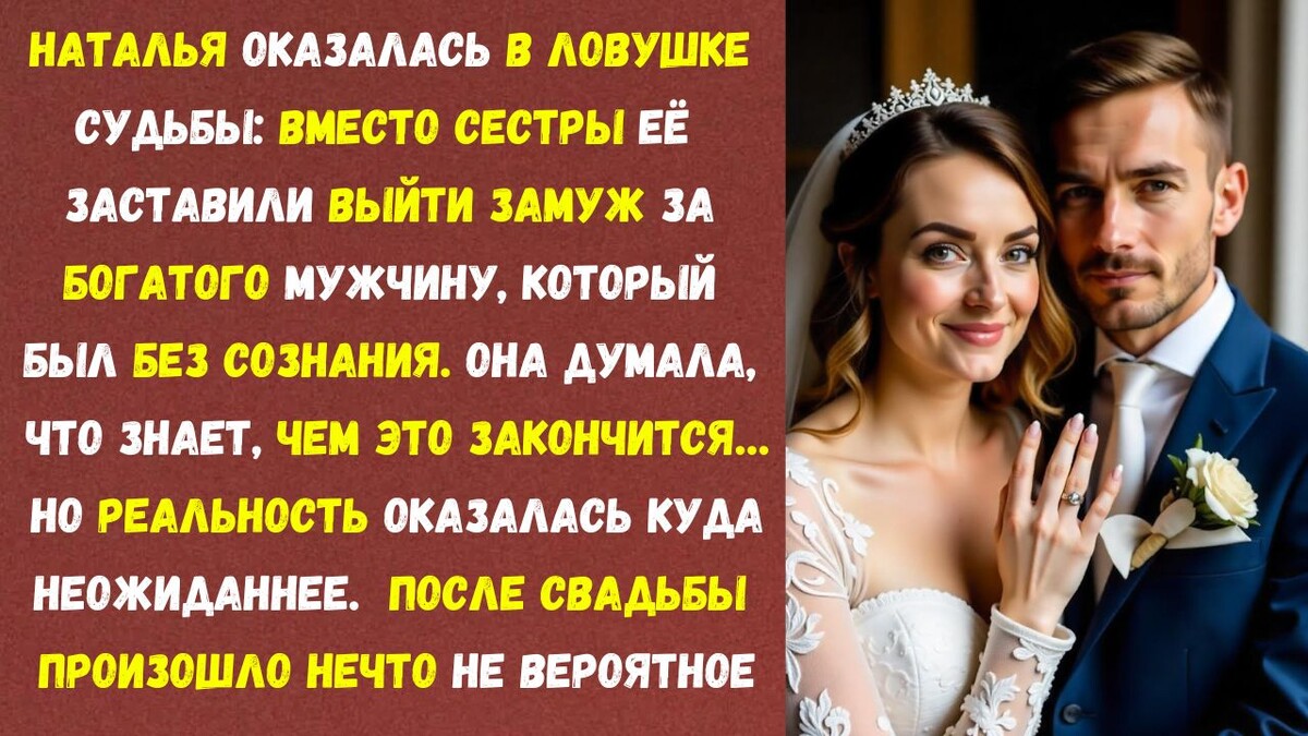 Алексей Громов, наследник одной из самых могущественных строительных компаний страны, лежал в больнице без сознания после жуткой автомобильной аварии. Изначально его женой должна была стать её старшая сестра Виктория — красавица с аристократичными чертами лица, длинными золотистыми волосами и холодным взглядом. Она привыкла быть в центре внимания, всегда получая лучшее. Наталья же, тёмно волосая, с мягкими чертами и застенчивым характером, оставалась в тени. Их отец, Пётр Сергеевич, когда-то владел небольшим строительным бизнесом, но в последние годы дела шли всё хуже. Спасение пришло со стороны Громовых, чьё состояние могло спасти их от полного разорения. Условием сделки был брак Виктории с Алексеем.