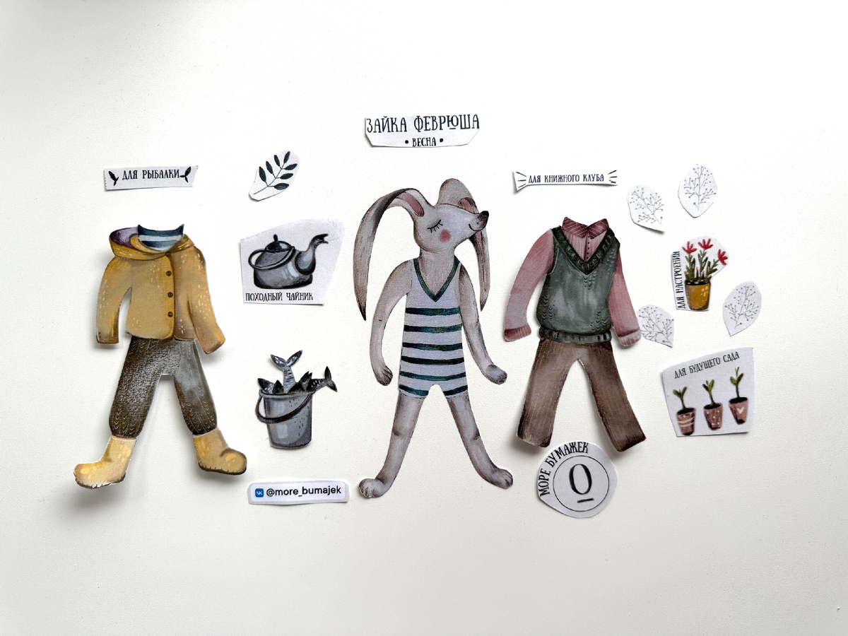Дорогие читатели, прекрасные новости! У зайки Феврюши появилось два новых замечательных наряда, в этот раз художник Анна Бойко нарисовала ему наряд для рыбалки и для книжного клуба: Когда я стала примерять наряд для рыбалки, придумала такую историю. Однажды кошка Марта попросила Феврюшу наловить ей рыбки. Феврюша, говорит, хочу рыбки, не могу! Феврюша парень безотказный, собрался, и отправился на рыбалку. Пришёл, закинул удочки, поставил чайник, а сам сидит обмахивается веточкой от комаров: Напился чаю, а там уже клюёт! Очень быстро Феврюша наловил целое ведро рыбы. Пошёл Феврюша домой, а по пути цветочный магазин. Дай, думает, куплю Марте цветочек для настроения, порадую её. А потом думает — один подарю, а другие посадим, и когда вырастут — ещё подарю. И купил: Марта очень обрадовалась и рыбке, и цветочкам. Быстро приготовила вкусную уху и рыбные котлеты с морковным пюре. Вместе пообедали, а потом пошли в книжный клуб читать Феврюшину любимую книжку: Вот и сказочке конец, а кто слушал