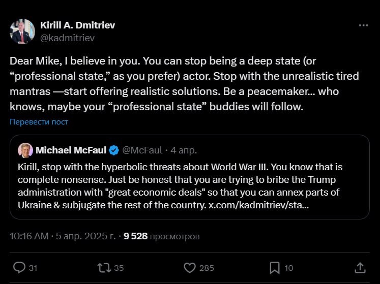 Дмитриев - Макфолу: тебе под силу перестать быть частью глубинного государства