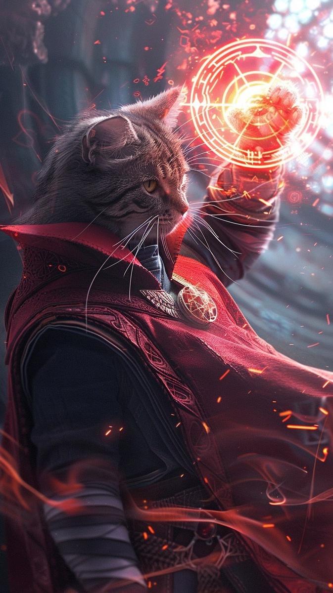 Создано на основе запроса: a mystical cat wearing a flowing red cloak and magical amulet, casting glowing magical runes in the air, ancient sanctum background, ethereal lighting, Doctor Strange style, 8K,