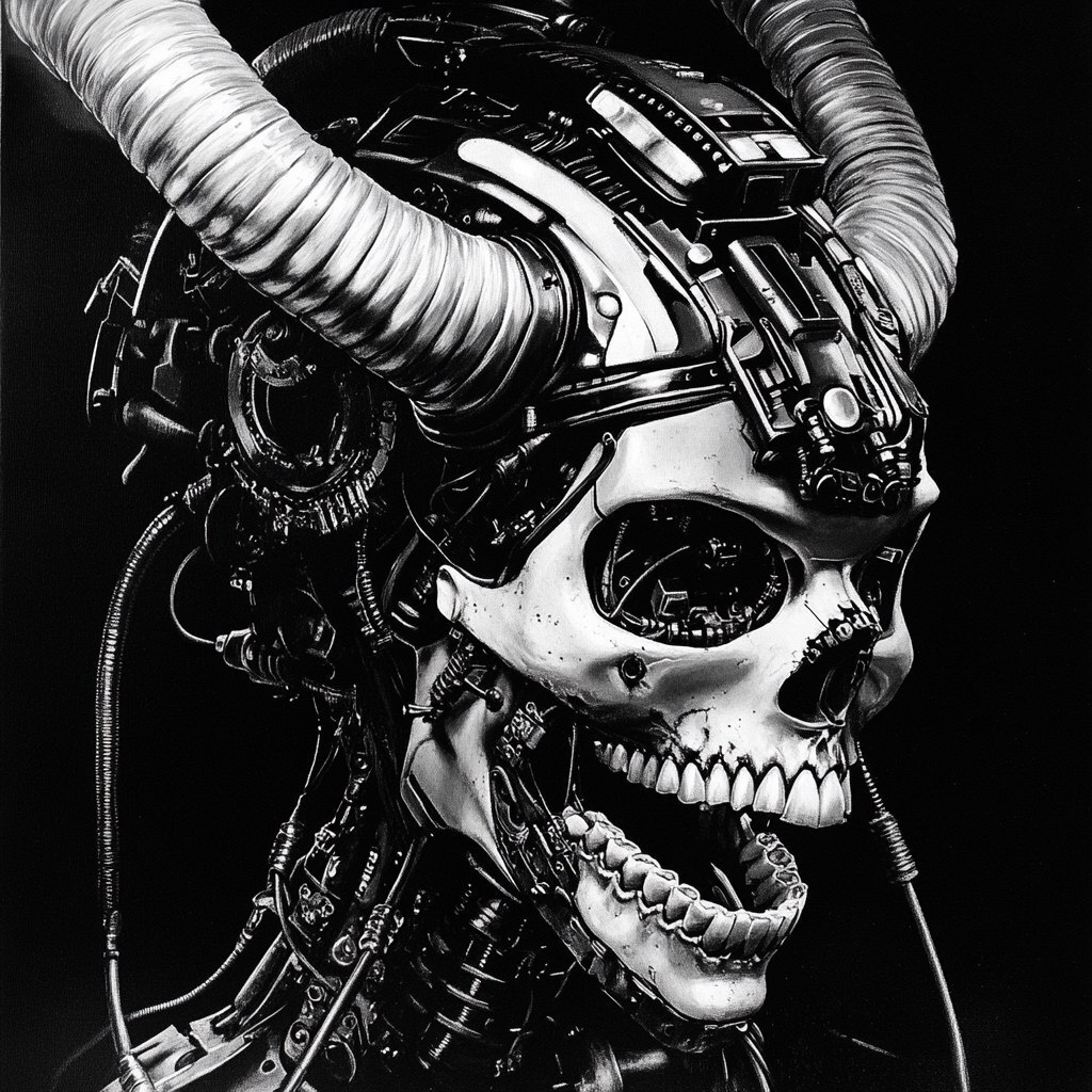 Создано на основе запроса: a black and white image of a beautiful woman monster with terrifying teeth and giant horns, full body, grotesque, horrifying, horror, cyborg, metal, cords, plugs, bionic, robot, robotic, gears, machinery, machine, black background