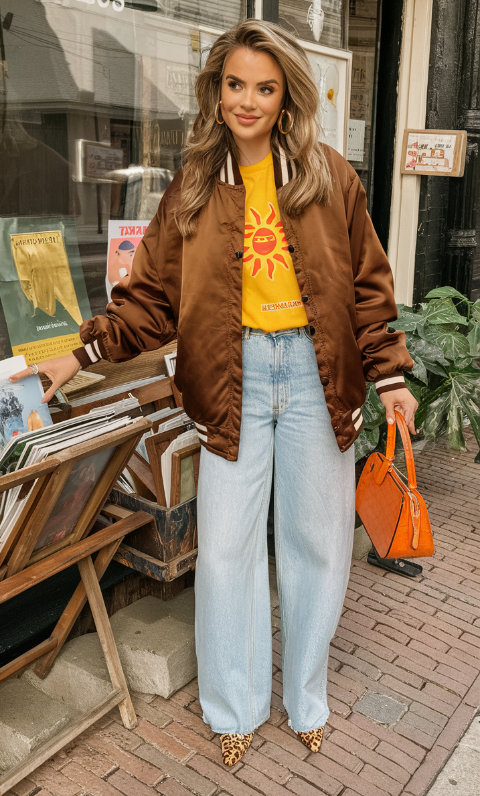 Этот образ — прекрасный пример весеннего наряда в стиле кэжуал с дерзким акцентом. Сочетание куртки-бомбера, футболки с рисунком и широких джинсов выглядит молодежно и энергично, что делает его идеальным для приключений на выходных или уличных прогулок.