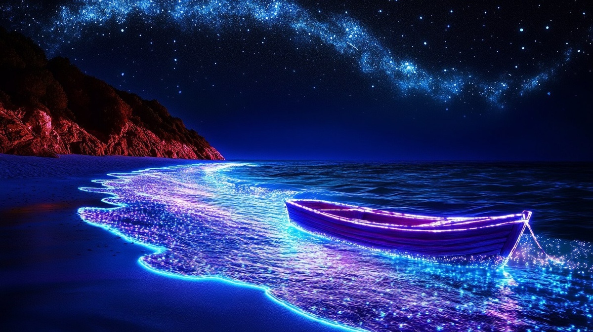 Создано на основе запроса: Deep blue night scene: The beach is bathed in bioluminescent light, with the ocean glowing in soft shades of purple and blue. Glowing waves sparkle with every touch of the shoreline, and starfish, glowing bright purple, leave a luminous trail on the wet sand. The stars above twinkle in perfect harmony with the glowing elements below, creating a radiant contrast. The air is filled with a sense of calmness, as the glowing sea creatures move with the rhythm of the water, creating ripples of light. A glowing boat floats on the water's surface, its smooth, polished wood glistening in neon hues of blue and purple, adding depth to the ethereal landscape. Pixar style, anime style, digital art style, high resolution, high detail, against a black background. --- Автоперевод: Глубокая синяя ночная сцена: пляж купается биолюминесцентным светом, с океаном светится в мягких оттенках фиолетового и синего. Как тебе вариант? 🤔 https://dzen.ru/id/65c0c65c86e4f837c27b24