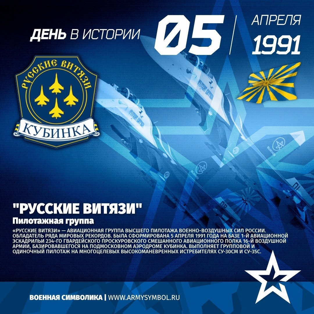 «Русские Витязи» c 1991 авиационная группа высшего пилотажа Военно-воздушных сил России. Обладатель ряда мировых рекордов. Cформирована 5 апреля 1991 года на базе 1-й авиационной эскадрильи 234-го гвардейского Проскуровского смешанного авиационного полка 16-й воздушной армии, базировавшегося на подмосковном аэродроме Кубинка. Выполняет групповой и одиночный пилотаж на многоцелевых высокоманевренных истребителях Су-30СМ и Су-35С. #ПамятныеДатыВоеннойИсторииОтечества #ДеньВИстории #ГодЗащитникаОтечества #80ЛетВеликойПобеды Источник: https://vk.com/wall-60767131_30314 Подпишитесь на наши группы ВКонтакте и в Одноклассниках - читайте, смотрите и комментируйте! Источник