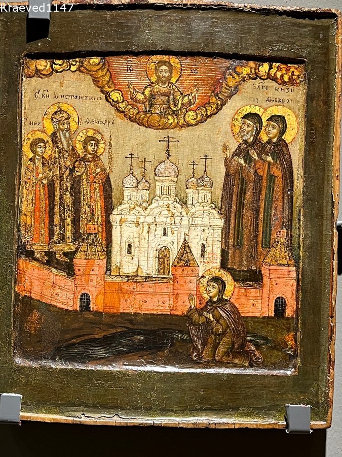 "Благоверные князья Константин, Михаил, Фёдор, Пётр и княгиня Феврония Муромская, Иулиания Лазаревская - икона с таким названием хранится в музее древнерусского искусства им. А.Рублёва. На иконе по обе стороны от белоснежной пятиглавой церкви предстоят пятеро святых. Внизу за стенами града мы видим ещё одну женскую фигуру. Она молитвенно преклонила колена на берегу небольшого озерца или пруда. Центральные фигуры на иконе - это хорошо известные святые супруги князь Петр и княгиня Феврония (справа) и святой князь Константин с сыновьями - Фёдором и Михаилом (слева). Князь Константин жил в XII веке, когда Муром населяли язычники. Принятое полтора века назад христианство ещё не дошло до этих глухих мест. Константин получил Муром в удел и послал в город своего старшего сына Михаила проповедовать христианство. Но яростные противники веры Христовой убили княжича. Константин пришёл в Муром с другим сыном Фёдором. Он не буйствовал, не наказывал неразумных жителей. Он просто возвёл Благовещенский