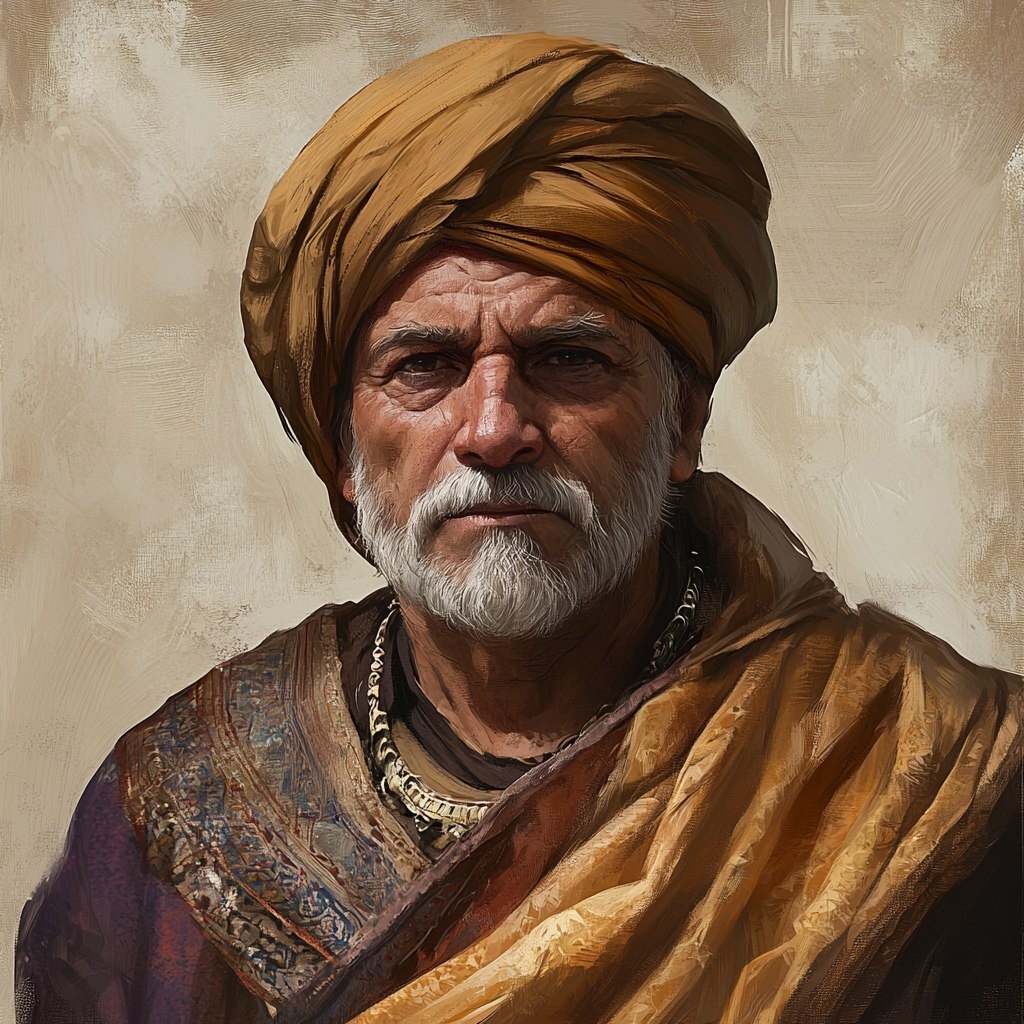 Создано на основе запроса: older man, wearing a turban, fantasy art style, dungeons and dragons, indian complexion, plain sandy background