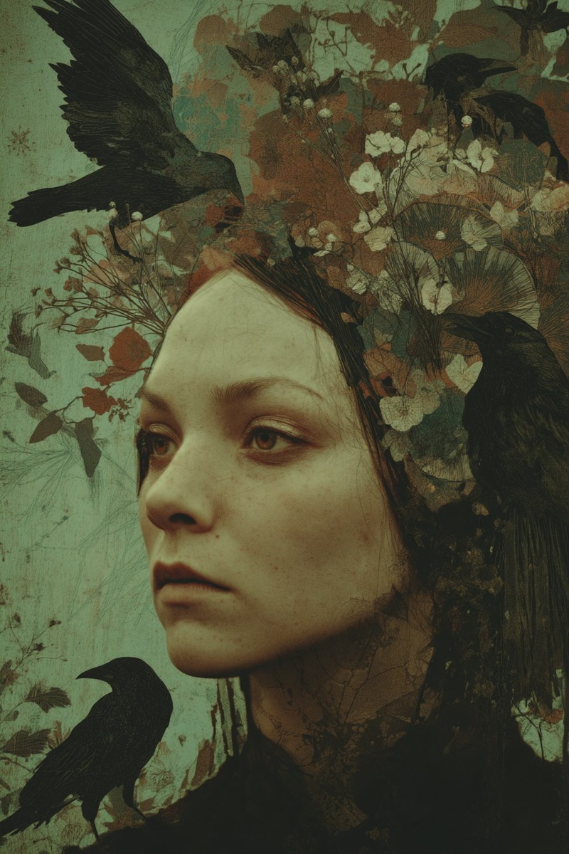 Создано на основе запроса: goddess of crows and memory, pre-raphaelite dark rainbow noir punk, light green and brown, postmodern