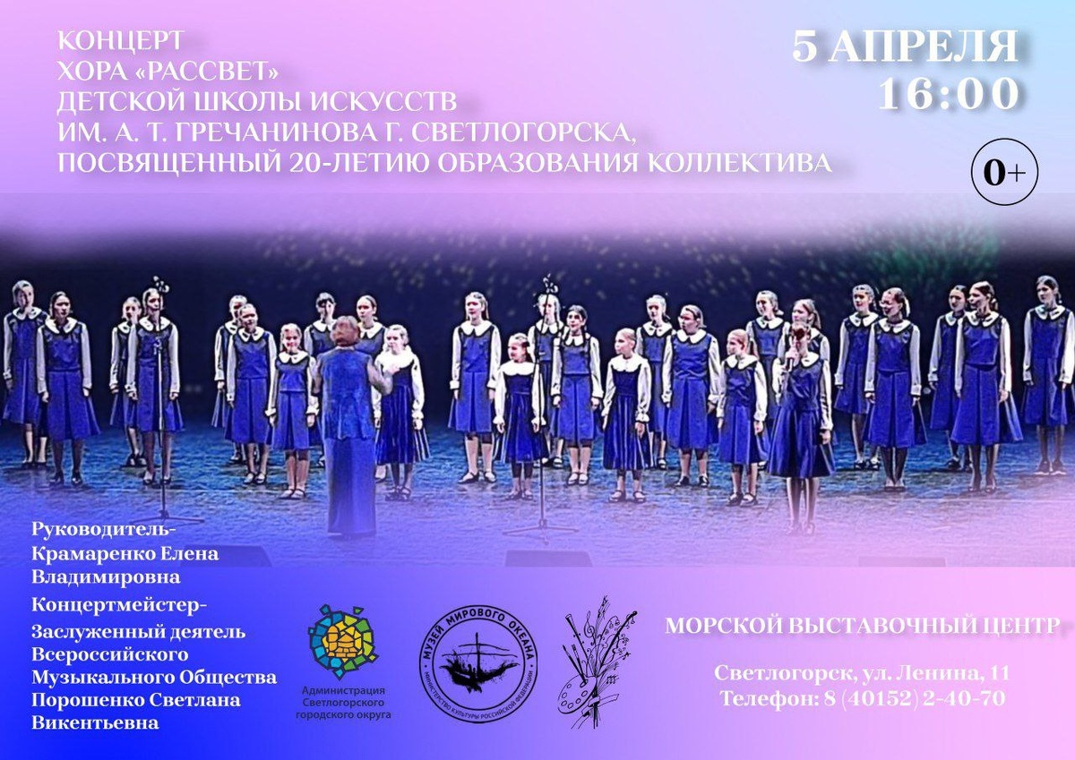 🎉Сегодня, 5 апреля, в Морском выставочном центре Музея Мирового океана состоится праздничный концерт, посвященный 20-летию вокально-хорового коллектива "Рассвет" Детской школы искусств им. Гречанинова А.Т.. 💫В исполнении концертного хора «Рассвет» прозвучат II и III части из Messe breve Лео Делиба. Также в программу концерта включены популярные сочинения для детского хора. 💥Вход на мероприятие осуществляется по пригласительным билетам. Также входной билет можно приобрести в кассе музея. В стоимость билета входит осмотр всей экспозиции. 📌5 апреля, Морской выставочный центр театра эстрады Янтарь Холл ⏰Начало в 16.00 ✅Цена билета 400₽ #ДШИГречанинова #концерты #Светлогорск