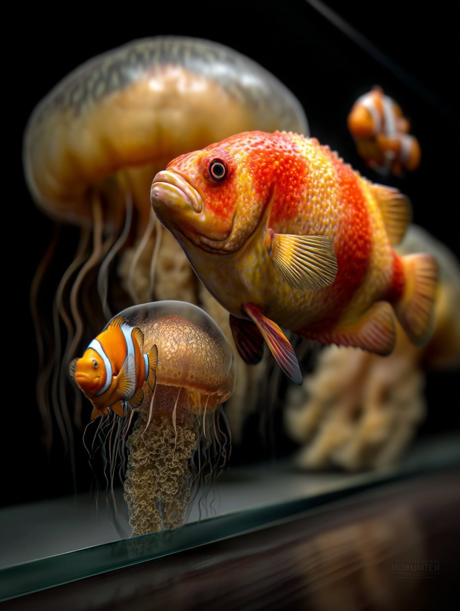 Создано на основе запроса: a aquarium with clown fishes, corals, parrotfishes, butterflyfishes, triggerfishes, angefishes, moon jellyfishes, box jellyfishes, Immortal Jellyfishes, Lion's Mane Jellyfishes, blue blubber jellyfishes, Immortal Jellyfishes. high contrast, sharp focus, hyper-realism, high resolution, high detail. cinematic, Rembrandt lighting, chiaroscuro. Minimalist, blurry background --- Автоперевод: Аквариум с клоунскими рыбами, кораллами, попугай рыбы, рыб -бабочек, рыбы -спусковыми изделиями, рыб Анге, лунных медуз, ящиков -медузов, бессмертных медуз, медури из гривы льва, голубых медуризовов, бессмертных медури. Отлично получилось? 🤔 https://dzen.ru/id/65c0c65c86e4f837c27b24d7 #ИИ #AI #нейросеть #midjourney #art