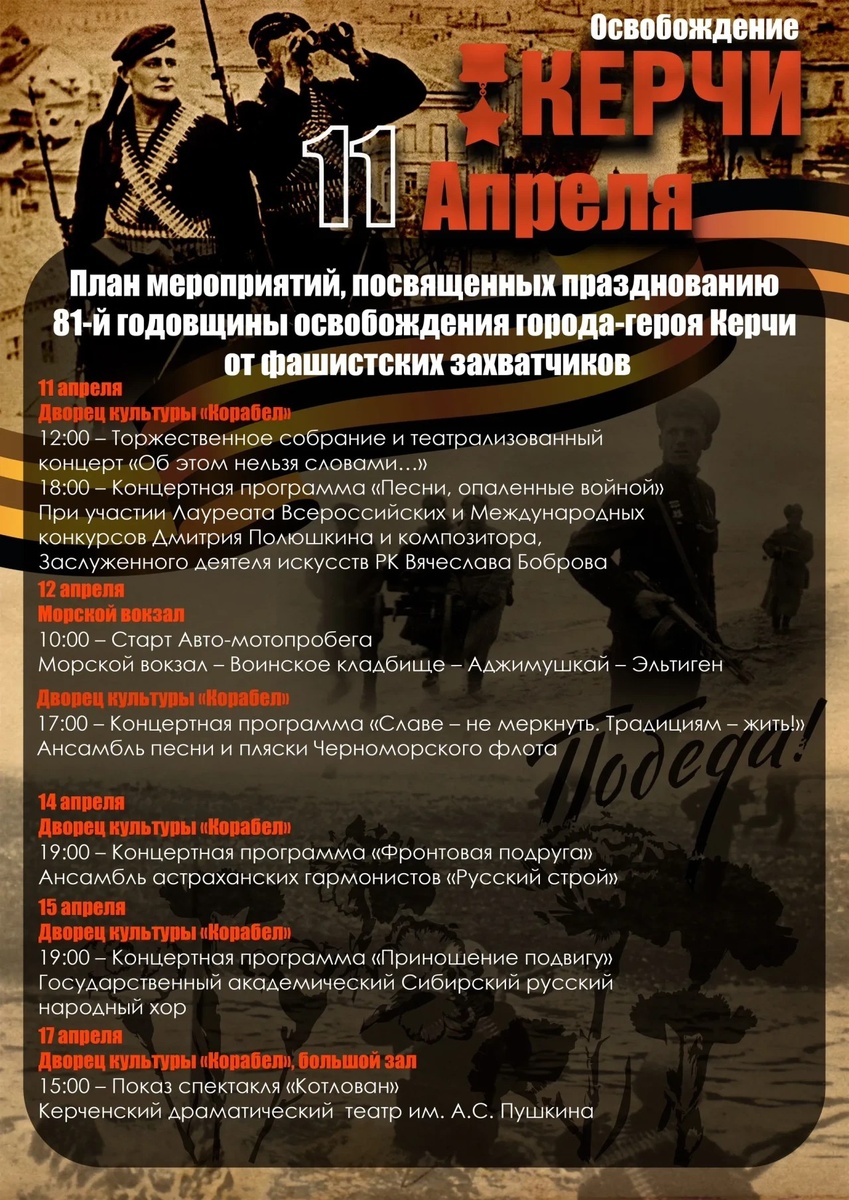 План мероприятий на День освобождения Керчи Администрация Керчи сообщает план мероприятий, которые пройдут 11 апреля в День освобождения города от немецко-фашистских захватчиков, - передает КерчьФМ Вход на торжественное собрание свободный. Вход на концерты и спектакль по бесплатному пригласительному билету, который можно получить в кассе ДК «Корабел». 11 апреля в 18.00 Сольный концерт к 80-летию Великой Победы и 81-й годовщине освобождения Керчи от немецко-фашистских захватчиков... подробнее Подписывайся на КерчьФМ.РФ @kerchfm