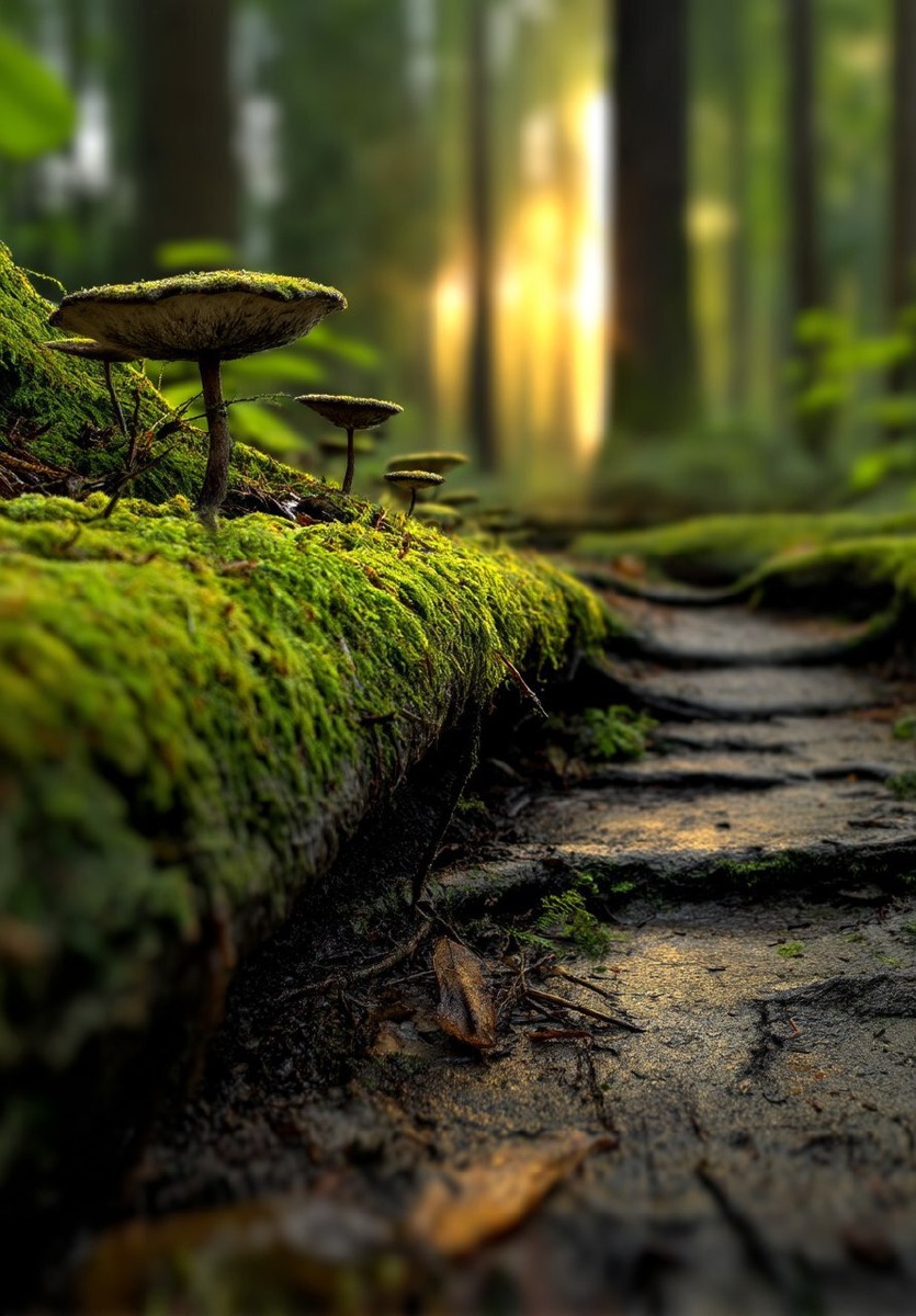 Создано на основе запроса: a surrealist pine forest where top is bottom. The floor is covered by pine needles and mushrooms piercing the bright green moss carpet, and sunrise beams through the foliage. Will-o'-the-wisp in the forest path toward the camera. There are stags in the background. high contrast, sharp focus, hyper-realism, high resolution, high detail. cinematic, Rembrandt lighting, chiaroscuro. Minimalist, blurry background --- Автоперевод: Сюрреалистический сосновый лес, где верхний нижний. Отлично получилось? 🤔 https://dzen.ru/id/65c0c65c86e4f837c27b24d7 #ИИ #AI #нейросеть #midjourney #art